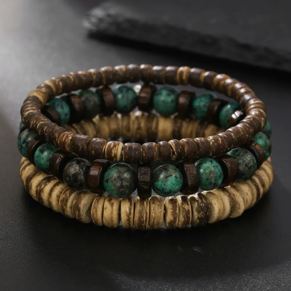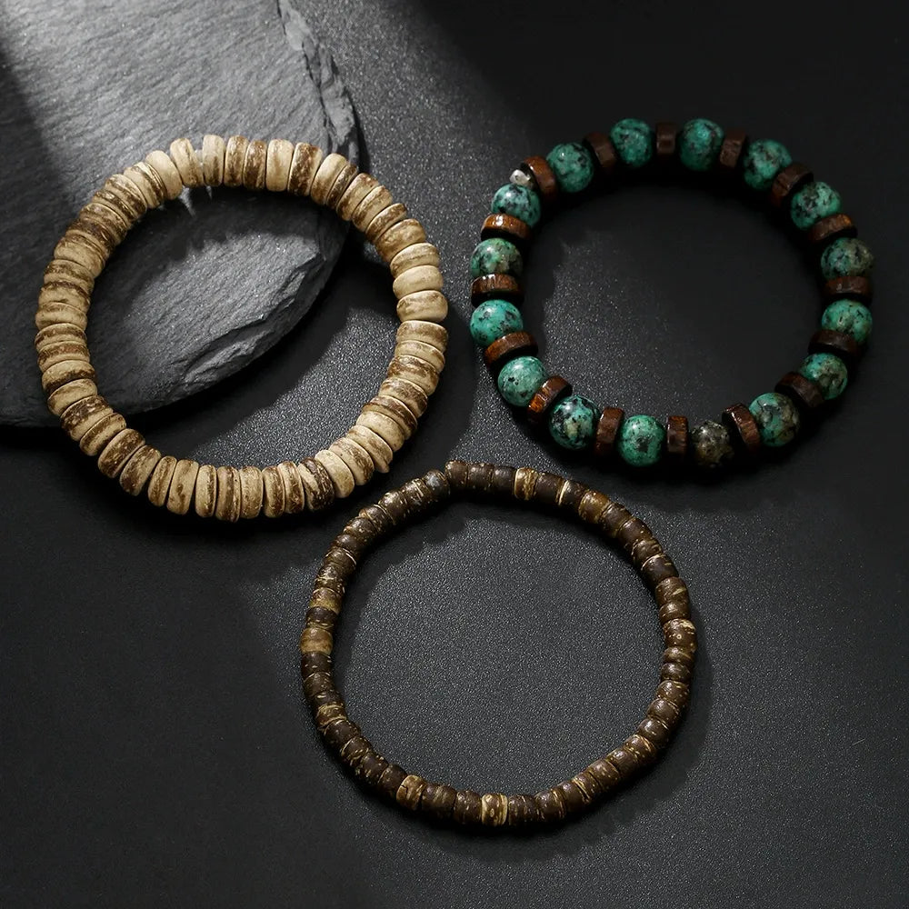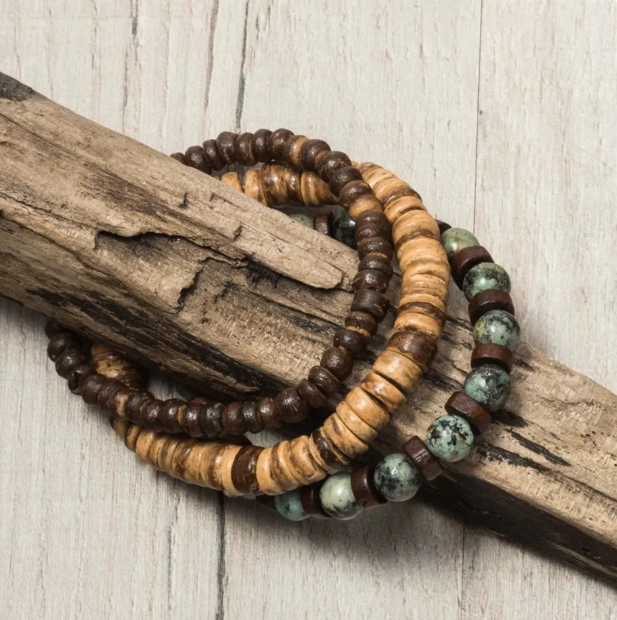 Features a set of bracelets with natural wood and turquoise beads, delivering a bohemian, earthy vibe. The mix of textures and colors allows versatile stacking or solo wear.