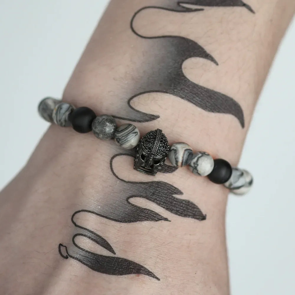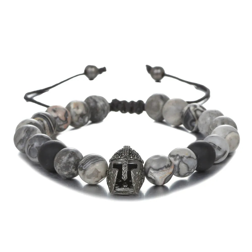 Features a detailed Spartan helmet charm paired with lava rock and natural gemstones, embodying courage and strength for a bold, masculine style.