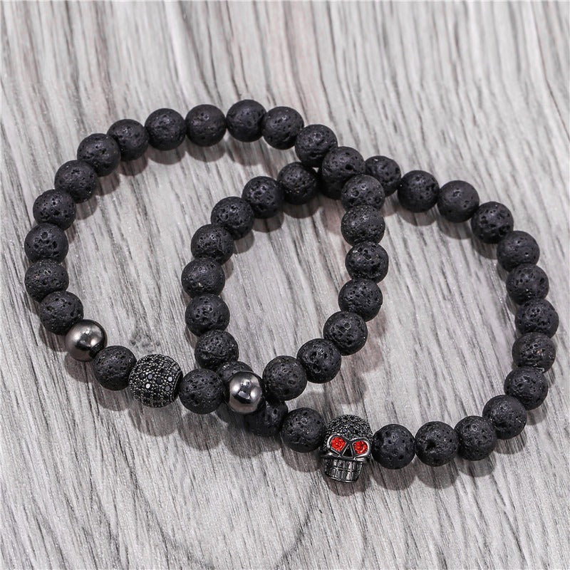 Features a striking skull charm with red accents and lava rock beads, delivering an edgy, gothic style for bold fashion statements. Lava rock serves as an essential oil diffuser, enabling portable aromatherapy.