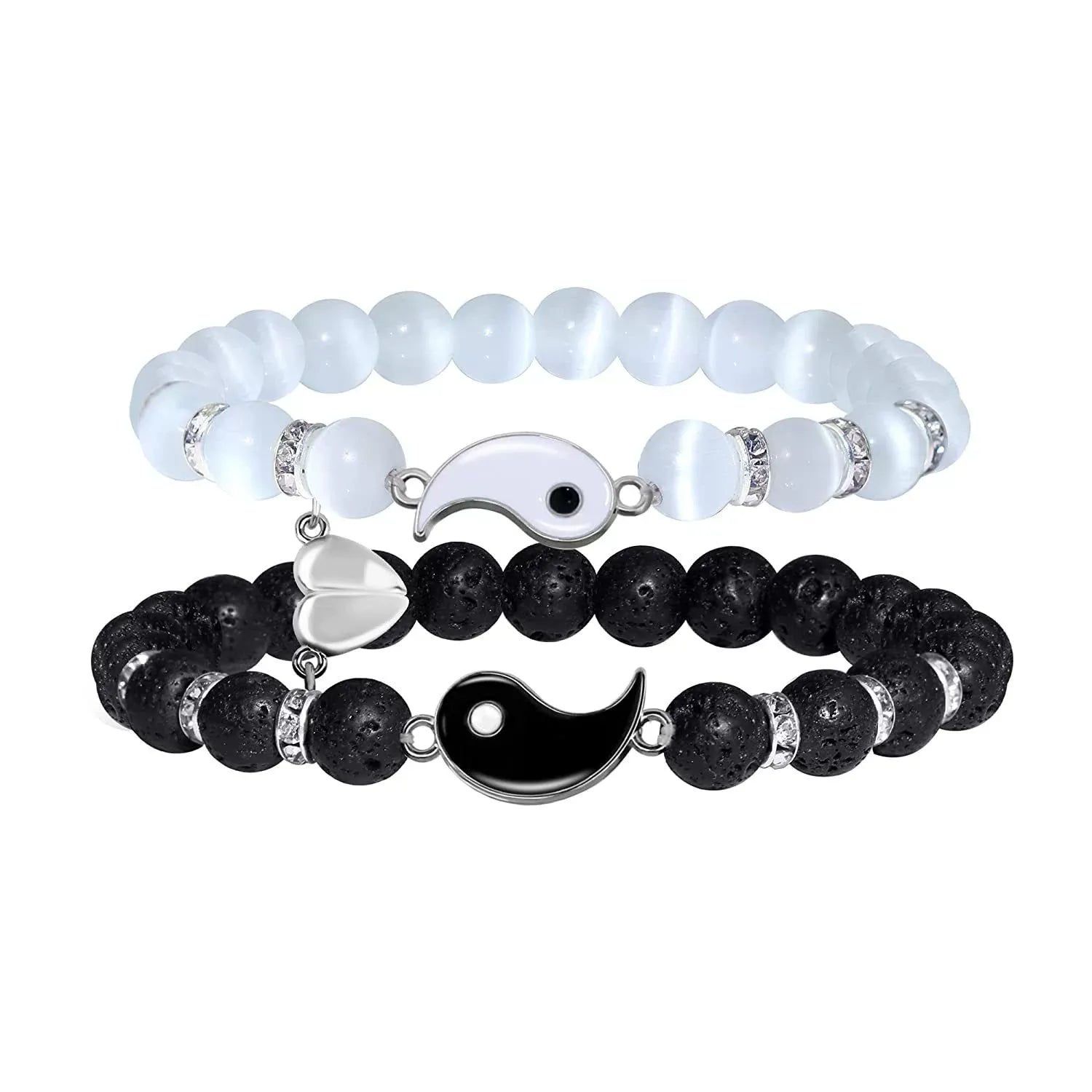 Features a layered bracelet set with yin-yang charm, black and white stone beads, embodying balance and harmony. The contrasting colors and textured beads create a stylish, symbolic look.